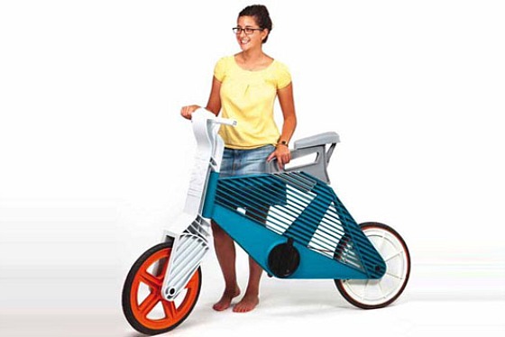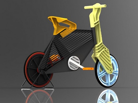 Using injection mold technology, this spunky Frii bicycle is made entirely from recycled plastic materials. Notice that apart from the stand, hardly any metal parts have been incorporated into the design, ensuring that it can be adapted from the materials available in any given location.